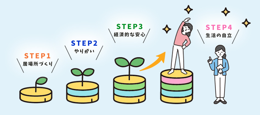 私達の理念である「障がいがあっても地域で継続して暮らしていけるための支援の実現」は、以下の4ステップを通じて支援いたします。